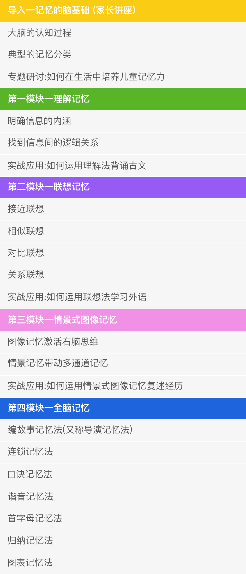学习力——超级记忆力训练课程将系统的训练孩子的右脑思维、启发右脑深层次记忆,活用图像、联想与创意等技巧,延展逻辑思考方式,建立有效的知识体系,轻松创建最短记忆路径,达到记忆力、专注力、学习力、想象力、创造力、观察力、逻辑力全面提升的学习效果!
